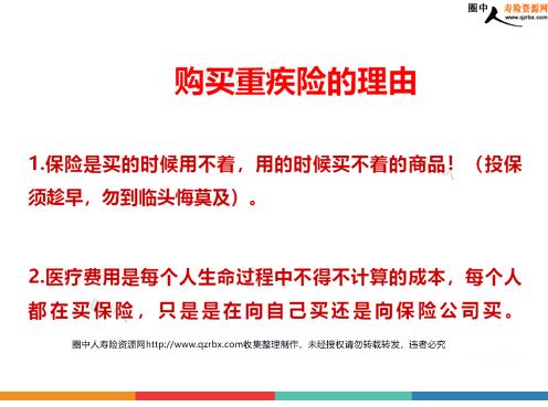 购买重疾险的理由 保险是家庭责任的分期付款,你可以说不需要保险,但是,你不可以代替你的妻子,儿女说他们不需要,虽然,你死去以后,可以一走了之什麽都不要,但是,妻子、儿女活着却万事艰难,什麽都需要——引自《生命的呐喊》购买重疾险的理由 1.保险是买的时候用不着,用的时候买不着的商品!(投保须趁早,勿到临头悔莫及)。 2.医疗费用是每个人生命过程中不得不计算的成本,每个人都在买保险,只是是在向自己买还是向保险公司买。 3.没有人因为买了保险而倾家荡产,但的确有家庭因为没有购买保险而倾家荡产…… 4.大病,正成为当前中国医疗保障制度最大的缺憾! 5.重疾险创始人马利尤斯·巴纳德医生曾说:医生治疗病人使之康复,但治疗是要资金做保障的。保险可以做到这一点。 6.梅艳芳走了,留给家人几千万保险金。傅彪走了,留给家人除了伤心还有什么?保险,宁可千日不用,不可一日不备。 7.择偶标准:一个人能买保险,至少说明:一有责任感;二有经济能力;三身体足够健康,否则保险公司不会为他保险。 8.有四种人不买保险:没钱的人;没责任心和爱心的人;已经出事的人;对保险缺乏了解的人。那么您是其中一种吗? 9.不买重疾险的好处是:省了一笔钱。坏处是:在这个充满意外和疾病风险的“工地”上,您连一顶最基本的“安全帽”都没有戴!结论是:赢得了一笔小钱,赌注是您的生命安全和家人的幸福! 10.生命价值在发展中不断提高。包头空难人均赔偿21.1万,6年后伊春空难人均赔偿96万,您也该加保了? 11.有保险的家庭有福气,有保险的人有福气。因为有保险,我们就保障了家庭幸福,保障子女成长,保障家庭资本增值。 12.保险不是储蓄,是保护您的储蓄;不是投资,是让您投资更放心;不是花钱,是让您守住钱。保险是一切投资活动的前提。 13.央视调查显示:超半数的癌症患者子女会放弃治疗。但如果儿女得了癌症,100%的父母选择:永不放弃! 14.咱们起早贪黑、省吃俭用,好不容易买了套大房子,结果一算,自己这条命就值个卫生间。在精心购置的豪宅里,最不值钱的我们,难道还能安心的躺在大房间里吗? 谢谢 ...........