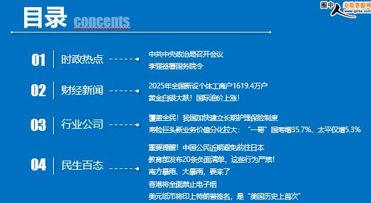 每日新闻速递 2026年3月28日 星期六 目录 时政热点 财经新闻 行业公司 民生百态 中共中央政治局召开会议 李强签署国务院令 2025年全国新设个体工商户1619.4万户 黄金白银大跌!国际油价上涨! 覆盖全民!我国加快建立长期护理保险制度 寿险巨头新业务价值分化拉大:“一哥”国寿增35.7%、太平仅增5.3% 重要提醒!中国公民近期避免前往日本 教育部发布20条负面清单,这些行为严禁! 南方暴雨、大暴雨,要来了 香港将全面禁止电子烟 美元纸币将印上特朗普签名,是“美国历史上首次” 时政热点 中共中央政治局召开会议 2026年3月27日16:39 来源:澎湃新闻 中共中央政治局3月27日召开会议,审议《中国共产党地方委员会工作条例》。中共中央总书记习近平主持会议。 会议指出,地方党委要坚决维护以习近平同志为核心的党中央权威和集中统一领导,把贯彻落实党中央决策部署作为重中之重,对党中央定下来的事扭住不放、狠抓落实,同时紧密结合本地区实际,增强工作主动性、创造性。 会议强调,地方党委在谋发展保安全上责无旁贷,要脚踏实地、真抓实干。要完整准确全面贯彻新发展理念,扎扎实实推动高质量发展,着力保障和改善民生,全力维护国家安全和社会大局稳定。要树立和践行正确政绩观,坚持为人民出政绩、以实干出政绩,努力创造经得起实践、人民、历史检验的实绩。 李强签署国务院令 2026年3月27日 11:31 来源:中国银行保险报 国务院总理李强日前签署国务院令,公布修订后的《全国农业普查条例》(以下简称《条例》),自2026年5月1日起施行。《条例》共7章44条,修订的主要内容如下。 一是完善农业普查基础制度。增加“各方共同参与”作为农业普查组织实施原则。增加乡村产业发展、乡村建设、乡村治理等事项作为农业普查内容。增加遥感测量等新普查方法,明确农业普查应当充分利用行政记录、社会大数据等资料。