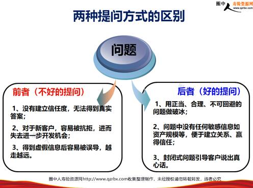 保险高端客户需求分析及其方案匹配 结果差距较大 面对客户相同 销售人员相同 实际情况 思考 想要钓到鱼,就应该像鱼一样思考,而不是像渔夫一样思考!生活中,钓鱼最关键的技巧是什么? KYC (KnowYourCustomer) 探究需求的技巧 为人规划,而非为钱规划 核心理念 成功close的关键要点 问题点 有些不便 不满,抱怨 明显、强烈的需求 对解决方案的关注 隐藏性需求 明显性需求 需求不明确 需求的发展过程 怎么办? 常见KYC问题 您的家庭结构是什么样的?您的资产范围在什么区间?您目前面临什么样的问题?针对这些问题有没有解决方案?在这些解决方案中有没有万无一失的选择?如果我们能提供一种安全、放心、隐秘的解决方案,您是否愿意共同讨论一下? 有效KYC问题 您好,能告诉我为什么选择我们银行吗?我们的优势是。。。。。。,不知道那一项对您最重要?为什么会选择这一项呢?您选择我们是否因为有一些其他银行和金融机构没能解决的问题?这个问题是不是对您的家人、朋友都需要保密?有很多解决方案,各有优劣势。。。。。。您希望以哪种方式去解决? 两种提问方式的区别 1、用正当、合理、不可回避的问题做破冰; 2、问题中没有任何敏感信息如资产规模等,便于建立关系、赢得信任; 3、封闭式问题引导客户说出真心话。