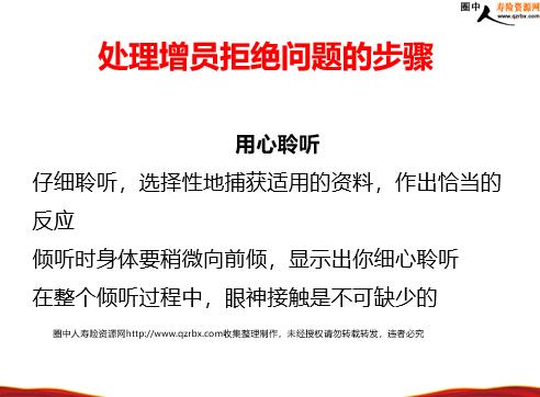 异议处理步骤及常见问题应对话术 处理流程用心聆听LISTEN 尊重理解SHARE 探究事实CLARIFY 提出方案PRESENT 请求行动ASK 增员面谈第四步:异议处理 用心聆听仔细聆听,选择性地捕获适用的资料,作出恰当的反应倾听时身体要稍微向前倾,显示出你细心聆听在整个倾听过程中,眼神接触是不可缺少的 处理增员拒绝问题的步骤 尊重理解尊重和理解是一种支持你并不需要同意他的意见,你只是认同他的感受! 探究事实—了解对方拒绝的真相!提出开放式的问题,重点是让被增员人有机会表达自己提问时,问题的深度应该一个比一个深入深入地追问问题是你进一步了解被增员人的重要技艺 提出方案告诉被增员人关于投身保险业的好处和利益 请求行动适当地向被增员人提出要求,可以令增员程序更顺利。 行业方面公司方面家庭方面个人方面 常见增员拒绝问题 1、保险没有底薪 准:“我接受不了没有底薪的工作呀!” 业:“您是担心这个行业没有底薪吗?非常感谢您告诉我您真实的想法,很多人都是这么想的。" 业:“那您以后打算做什么?” 准:“我想先考一个资格证,自己开一家事务所” 业:“一个人做吗?” 准:“打算再招四、五个人吧!” 业:“他们的薪水谁发呢?”,“我发!” 准:“你的薪水呢?”,“当然自己赚钱自己发喽!” 业:“那你岂不是不仅自己没有底薪,而且还要发四、五个人的工资吗?” 准:“…,你说的有道理,让我再好好想想。” 业:“所以哦,并不是没有底薪让你害怕,而是因为你对这个行业的收入结构还不了解,事实上,从事保险是个人创业,初期只有一个人是会有些不稳定,但我们有财务补助,当我们发展成一个团队,有管理津贴、续佣,以及首佣,那时会稳定在比较高的收入水平上。……..” ...........