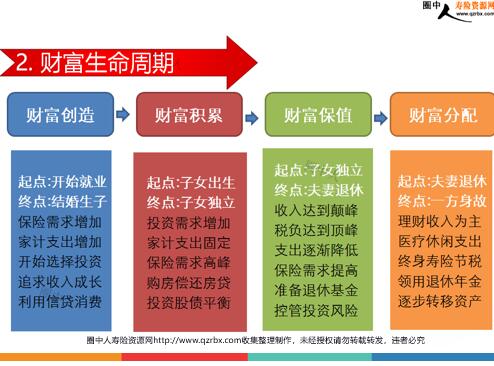 家庭生命周期及需求解析 生命周期 1.生命周期的四个阶段 起点:开始就业终点:结婚生子保险需求增加家计支出增加开始选择投资追求收入成长利用信贷消费 起点:子女出生终点:子女独立投资需求增加家计支出固定保险需求高峰购房偿还房贷投资股债平衡 起点:子女独立终点:夫妻退休收入达到颠峰税负达到顶峰支出逐渐降低保险需求提高准备退休基金控管投资风险 起点:夫妻退休终点:一方身故理财收入为主医疗休闲支出终身寿险节税领用退休年金逐步转移资产 财富创造 财富积累 财富保值 财富分配 2.财富生命周期 3.春耕客户现状和特征 定义:结婚到第一个子女出生年龄:25-35岁居多支出:日常花销大,主要是服饰、娱乐支出;进修充电支出;结婚费用支出储蓄:刚工作,收入不高,家庭支出压力大,结余不多保障:还未考虑家庭保障,或者保额偏低,家庭财务有风险敞口资产:可投资资产有限,但由于年轻,可承受较高的投资风险负债:由于购房需求,一般负债较高