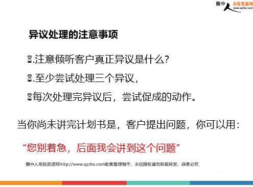 异议处理的概述及其四大类处理方法与话术 课程大纲 一、异议处理概述二、四大类异议处理三、角色扮演四、通关 异议处理定义 异议处理是营销员获得客户信任,调整客户心态,消除其疑虑,最终促使其购买保险商品的行为与过程。 一、异议处理概述 异议只是客户习惯性的反射动作通过异议可以了解客户的真正想法对异议问题的处理就是导入促成的最好时机 客户有异议是正常的 异议的本质 因客户而产生不信任(约占55%)不需要(约占20%)不了解商品特性及利益(约占10%)安于现状、不急(约占10%)其他借口(约占5%) 因我们而产生专业知识不足给客户印象不佳 异议产生的原因 -以平常心对待,不要紧张; -不要与客户争辩; -要有信心,树立专业人士的权威感; -准备充分。 客户有异议是正常的 异议处理的原则 异议处理的步骤 .注意倾听客户真正异议是什么? .至少尝试处理三个异议,每次处理完异议后,尝试促成的动作。当你尚未讲完计划书是,客户提出问题,你可以用: “您别着急,后面我会讲到这个问题” 异议处理的注意事项 二、四大类反对问题 不论需求分析或建议书说明的多么好,基于人性的弱点、或是客户需要多一些的信息提供,他都有可能在此时提出反对问题。归纳这些反对问题一共有4大类:没钱、不急、没信心、不需要,问题可能会这样出现… (1)没钱:「没有多余的钱」、「负担不起」(2)不急:「我考虑一下」、「过一阵子再说」(3)没信心:「我宁可把钱存在银行!」(4)不需要:「我太太在婚前有工作的经验,所以应该还可以赚钱!」