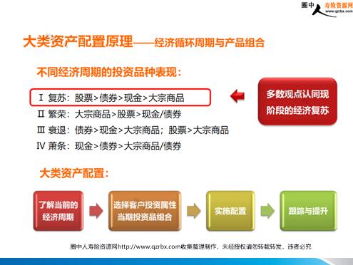 大类资产配置原理 及家庭资产配置方法 走进资产配置 大类资产配置原理——经济循环周期的选择 股票 大宗商品 现金 债券 大类资产配置原理——中国的资本市场 20%股票投资+80%债券投资 大类资产配置原理——经济循环周期与产品组合 不同经济周期的投资品种表现: Ⅰ复苏:股票>债券>现金>大宗商品 Ⅱ繁荣:大宗商品>股票>现金/债券 Ⅲ衰退:债券>现金>大宗商品;股票>大宗商品 Ⅳ萧条:现金>债券>大宗商品/债券 多数观点认同现阶段的经济复苏 大类资产配置: 走进资产配置 简易版家庭资产配置方法——基础步骤 简易版家庭资产配置方法——常见的银行配置清单 简易版家庭资产配置方法——核心原理 简易版家庭资产配置方法——人生财务曲线及需求 人生目标货币化 家庭可用资金 短期 长期 中期 确定日常开支、周转的支出 确定人寿、重疾的保障支出 确定养老、子女教育的支出 确定财富传承、保全的规划 简易版家庭资产配置方法——人生财务曲线及需求 剔除短、长期安排后,剩余的资金,再根据客户的风险评级,做中期的“资产配置”建议简易版家庭资产配置方法——确定现金需求 K:家庭每月需预留多少现金用于日常的生活开销? 货币及现金类资产=每月开销×6 K:近期是否对资金有特殊安排如购房/车、生意周转、子女学费等? 现金类资产配置:存款、日添利、一年以内的理财产品、货币基金、类理财基金 简易版家庭资产配置方法——保险类资产推荐原理 简易版家庭资产配置方法——投资资产配置原理 简易版家庭资产配置方法——投资资产配置原理 大类资产配置原理——资产配置涵盖内容 综合 全面资产配置 ◎全面搭配,降低风险、提高收益 收益性 基金检视计划 ◎整理历史投资、安排全新方向