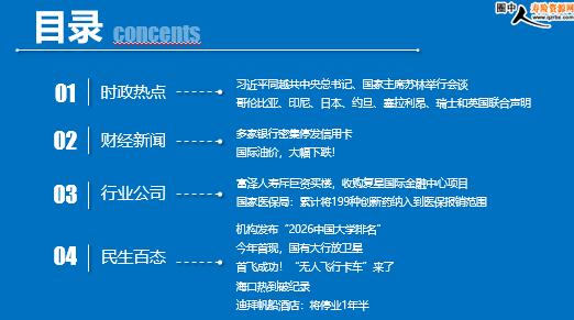每日新闻速递 2026年4月16日 星期四 目录 时政热点 财经新闻 行业公司 民生百态 习近平同越共中央总书记、国家主席苏林举行会谈 加拿大、巴西、澳大利亚、哥伦比亚、印尼、日本、约旦、塞拉利昂、瑞士和英国联合声明 多家银行密集停发信用卡 国际油价,大幅下跌! 富泽人寿斥巨资买楼,收购复星国际金融中心项目 国家医保局:累计将199种创新药纳入到医保报销范围 机构发布“2026中国大学排名” 今年首现,国有大行放卫星 首飞成功!“无人飞行卡车”来了 海口热到破纪录 迪拜帆船酒店:将停业1年半 时政热点 习近平同越共中央总书记、国家主席苏林举行会谈 2026年4月15日 17:35 来源:环球网 4月15日上午,中共中央总书记、国家主席习近平在人民大会堂同来华进行国事访问的越共中央总书记、国家主席苏林举行会谈。 习近平再次祝贺苏林当选越南国家主席。习近平指出,你当选越南国家主席后第一时间到访中国,体现了你对发展中越关系的高度重视。相信在以苏林同志为首的越共中央坚强领导下,越南必将坚定走好社会主义道路,朝着建党建国“两个一百年”奋斗目标砥砺奋进。无论国际形势如何变化,中方始终将越南作为周边外交优先方向,愿同越方秉持初心、赓续友谊,团结协作、相互支持,继续按照“六个更”总体目标,高质量推进全面战略合作,加快构建更高水平具有战略意义的中越命运共同体,为推动构建人类命运共同体作出更大贡献。 加拿大、巴西、澳大利亚、哥伦比亚、印尼、日本、约旦、塞拉利昂、瑞士和英国联合声明 2026年4月15日 13:10 来源:澎湃新闻 加拿大、巴西、英国等10个国家14日发表联合声明,对黎巴嫩日益恶化的人道主义局势深表关切,并呼吁立即停止一切敌对行动。 该声明由加拿大、巴西、澳大利亚、哥伦比亚、印度尼西亚、日本、约旦、塞拉利昂、瑞士和英国共同签署,强调必须尊重并保护那些致力于援助最脆弱群体的人道主义救援人员,停止对他们的袭击。声明“以最强烈措辞”谴责导致联合国维和人员死亡和显著增加黎巴嫩南部人道主义救援人员风险的行为。声明说,对伤害人道主义救援人员或阻碍其活动的违反国际法行为进行严肃追责和实现司法公正至关重要。 黎巴嫩卫生部12日表示,自3月2日黎以战火重燃以来,以色列对黎巴嫩发动的袭击已造成2055人死亡、6588人受伤。