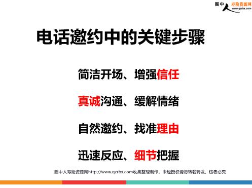 电话邀约的关键步骤及销售面谈的逻辑 电话邀约赢得信赖把控现场成就签单 两个环节注重专业与细节把握 电话邀约前的重要准备 进行客户保单深度查询,包括投保人名下所有保单信息被保险人名下所有保单信息受益人名下所有保单信息 详细记录客户信息,包括身份证、出生日期、产品种类分红情况、受益人情况、出生证情况 深度查询保单信息的主要原因全面了解客户家庭情况、保单情况,同时也为以后的客户维护打下基础客户不信任自己身份时,可充分列举保单,增强客户信任感找到邀约客户的关键理由 电话邀约中的关键步骤 简洁开场、增强信任真诚沟通、缓解情绪自然邀约、找准理由迅速反应、细节把握 电话邀约中的关键步骤 简洁开场、增强信任确认身份:您好,请问是xx先生/女士吗?自我介绍:我姓杨,叫xx,是xx保险财富管理中心的服务专员。(不等客户回答)保单确认:您于某年某月某日在某银行网点购买了某产品,请问您还记得吗? 真诚沟通、缓解情绪确认有无专人服务:这边给您做个回访,请问有专门的理财经理给您做服务吗?(多数客户无人服务并表达不满)消除无人服务投诉:关于这个问题我首先代表公司向您道歉,这个产品是我们公司委托银行代理销售的,之前在售后服务上可能确实有所疏忽,所以公司专门成立了我们部门,并且安排我来专门为您服务。 自然邀约、找准理由三个让客户难以拒绝的理由分红报告书邀约受益人变更邀约出生证变更邀约 自然邀约、找准理由——分红报告书邀约我:xx先生,因为您购买的是分红型产品,每年都有一份分红报告,今年的分红报告您有收到吗?客户:没有我:没有关系,我帮您重新申请打印一份,您今天下午三点有时间来我们公司了解下您的分红情况吗?客户:你邮寄给我好了我:我们公司有规定,不能通过邮寄方式,为了您的隐私安全,我们要亲自送达您本人,分红报告关系到您的资金情况,相信您也不希望泄露,是吧?客户:那好吧