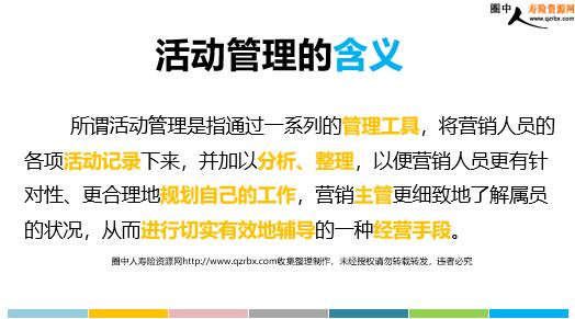 目标与 活动管理的概述与 做法 目录 目标管理概述活动管理概述如何做好目标活动管理 用系统化的方式把许多关键的管理活动集中起来,有意识的引导组织成员高效地实现组织和个人的目标。 目标管理的含义 目标的威力 哈佛大学曾对其100名毕业生25年以后的状况进行了追踪调查,结果如下: 目标的威力是巨大的,缺乏一个明确的梦想,即对人生的一种设计,或许是许多人很少得到提拔和不能赚到更多金钱的原因。正像西方一句谚语所说的:“如果你不知道你要到哪里去,那通常你哪里也去不了。”人生规划的设计是要使你的注意力集中起来,在一个特定的时间范围内充分利用你的脑力和体力。 目标的威力 目标订立的意义 订立明确的目标是事业成功的前提帮助明确各阶段的任务帮助达成本阶段预期目标 明确的--可表述清楚不含糊可达成--具有挑战性并切合实际适合的--适合于本人取得的目标实效性--有结束和完成的日期 目标订立的原则 分析现状确定目标量化目标设定期限 目标订立的步骤 你想得到什么?你想成为怎样的人?你想花多长时间?你想付出怎样的代价? 目标订立的要素 目标决定行动,目标决定成功,你的人生目标是什么?在2026年的目标是什么?你近段时间的目标是什么?…… 思考 目录 目标管理概述活动管理概述如何做好目标活动管理 好记性不如烂笔头 --俗话说想到就要做到,做到就要记录 --ISO900专家每一笔往来账都要记清楚 --老财务的忠告 所谓活动管理是指通过一系列的管理工具,将营销人员的各项活动记录下来,并加以分析、整理,以便营销人员更有针对性、更合理地规划自己的工作,营销主管更细致地了解属员的状况,从而进行切实有效地辅导的一种经营手段。
