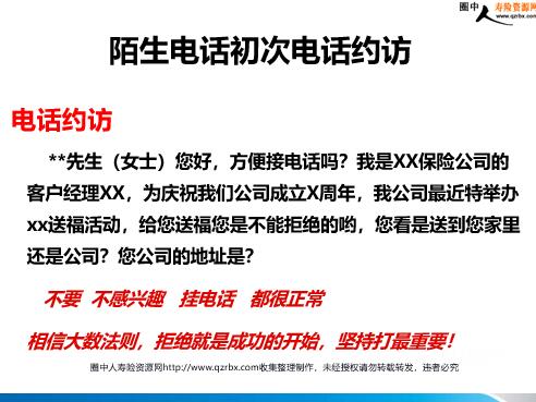电话约访与面谈的逻辑 一.电话逻辑 陌生电话初次电话筛选 **先生(女士)您好,方便接电话吗?我是XX保险公司的客户经理XX,最近我们公司新推出一款专门针对您这样的高端人士的医疗养老方案,不是让您购买,只是让您了解一下,您看是给您送过去还是发邮件给您?发邮件就留邮箱!不要不感兴趣挂电话都很正常相信大数法则,拒绝就是成功的开始,坚持打最重要! 电话约访 回访电话的交流 **先生(女士)您好,方便接电话吗?我是XX保险公司的客户经理XX,上次给您邮箱里发了一份我们公司最适合您的一个医疗养老方案,想和您交流一下!那您看下次什么时候再打给您?(邮件发不发都行) 不要不感兴趣没看没时间记录每次电话的时间相信大数法则,拒绝就是成功的开始,坚持打最重要! 回访电话 陌生电话初次电话约访 **先生(女士)您好,方便接电话吗?我是XX保险公司的客户经理XX,为庆祝我们公司成立X周年,我公司最近特举办xx送福活动,给您送福您是不能拒绝的哟,您看是送到您家里还是公司?您公司的地址是?不要不感兴趣挂电话都很正常相信大数法则,拒绝就是成功的开始,坚持打最重要!电话约访 电话邀约参加活动 **先生(女士)您好,方便接电话吗?我是XX保险公司的客户经理XX,为庆祝我们公司成立X周年,我公司本周六上午10点特举办xx客户联谊活动,来就有礼品相送还有抽奖活动!我手上有两个名额,您可以带一个朋友过来一起参加,我们是要凭邀请函入场抽奖!您看邀请函我是今天还是明天给您送过来?(快递过来)我也想快递过来,但是要签收的!不要不感兴趣挂电话都很正常相信大数法则,拒绝就是成功的开始,坚持打最重要! 二.面谈逻辑 站在客户的立场如果要规划一份保险 1选择一个专业诚信的代理人(讲自己) 2选择一个专业品牌的保险公司(讲公司) 3选择一个适合自己的保险产品(讲产品,讲行业) 讲三讲 什么是保险?保险=钱小钱换大钱 200元10万保费保额 保险可以为我们解决什么?保险解决三件事 1、大事:身故、残疾、重疾 2、小事:虫叮蚊咬、发烧感冒 3、无事:养老、储蓄、投资理财 保险怎么买?讲2个观念 1---保险阶梯(意外、疾病、教育和养老、理财) 2--家庭平衡理财四大账户