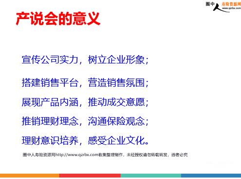 保险产说会运作要领及促成技巧 内容 产说会的意义作用产说会的运作要领产说会的促成技巧产说会的礼仪规范 产说会的意义和作用 产说会的意义 宣传公司实力,树立企业形象;搭建销售平台,营造销售氛围;展现产品内涵,推动成交意愿;推销理财理念,沟通保险观念;理财意识培养,感受企业文化。 爆发力:发挥资源优势,扩大业务规模,有效推动业务进步持久力:保持和扩大客户资源,稳定客户和提高客户忠诚度执行力:对理财经理活动量、服务营销技能的大练兵、大考核。产说会的意义 强化了意义功用展现了产品内涵营造了促成氛围推动了成交意愿 产说会的作用 基于顾客需求的销售循环 产品说明会的作用 产说会的作用 催开90度的水 产说会的特点与局限 产说会的流程程式化产说会的内容格式化产说会的形式是一对多,缺乏互动 产说会运作要素和要领 产说会经营的三大要领 产说会经营成功的决定因素 任何会议成功与否会前就能决定产说会会前的经营 对理财经理而言 a.注意客户的积累,筛选优质客户 b.熟悉答谢会流程,配合默契,注意气氛的配合 c.掌握答谢会内容,事先测算险种与保费 d.主动去接客户 e.会场纪律的强调 f.客户数量目标 g.告知奖品、时间、地点,力邀客户到场 h.包装讲师;(邀请客户的方法)