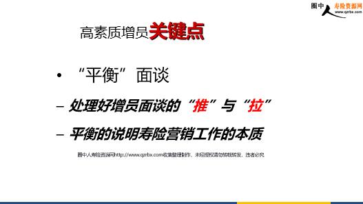 认识潜在高素质业务员及其增员面谈流程关键 一、建立团队的关键要素二、认识潜在高素质业务员三、高素质增员的面谈流程和关键 目录 在寿险行业建立一个年利润百万甚至千万以上的永续经营企业?成为经理人? 成为经理人首先必须建立的一个基本理念 在寿险行业建立一个年净利润百万甚至千万以上的永续经营的企业,并愿意为此付出必要的基本代价 为了建立一个年利润百万甚至千万以上的永续经营的企业,你愿意付出时间和精力去选择优秀的合作伙伴吗? 一、建立团队的关键要素(S.R.T) Selection -选择 Recruting -增员面谈 Training -辅导训练团队的建立 不同素质的业务员对经理人所消耗的成本或所创造的效益相差几十倍甚至上百倍 ——选择正确的人同一个人面对不同的增员人和面谈所形成的寿险营销认识相差几十倍甚至上百倍 ——用正确的面谈流程同一个素质的业务员用不同的辅导训练方法所产生的绩效相差几十倍甚至上百倍 ——用正确的方法辅导育成 不同素质的业务员对经理人所消耗的成本或所创造的效益相差几十倍甚至上百倍 选择的意义与功用 一个人五年的时间是否发生变化以及发生怎样的变化,取决于你与哪些人在一起、听了哪些不一样的课程,或者读了哪些不一样的书! 为你的企业增“帮手”还是增“包袱”? 中国是世界上潜在的高素质寿险从业人员资源最丰富的国家 一块钻石与一大堆煤炭之间的区别就在于形成时间、所受压力和自身价值方面存在广泛的差异 只付出很少时间、精力和财力,满足于得到煤炭而不企盼获得钻石,是增员和组织发展的严重错误 增员的重大误区 高估自己改变人的能力低估自己选择人的能力 人品好丰富的人脉关系良好的沟通能力认真严谨的工作态度良好的工作计划和记录的习惯开放的心态、不断地学习和总结 有人帮你观察了3年时间至少认识百人以上至少3年以上的时间证明 3年以上的证明 3年以上的证明 3年以上的证明 谁一定能做好保险? 选才三步曲 第一步:工作背景 ——指一个人的职业生涯概况,包括工作年限、工作单位、行业、职级等从业的基本信息第二步:工作模式 ——指一个人的具体工作岗位及其日常工作职责和工作方式(包括工作时间及工作内容,以及因长期从事该岗位而形成的知识、态度、技能与习惯等)
