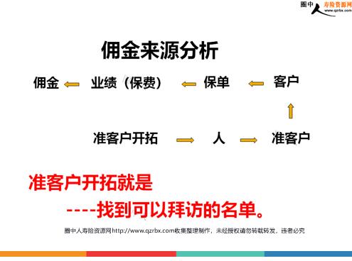 保险准客户开拓的方法与话术 佣金来源分析 准客户开拓就是 ----找到可以拜访的名单。 佣金 业绩(保费) 保单 客户 准客户 准客户开拓 活动体验 请写出“口”字加两笔所有的字 口 上:古、台、占、召…… 下:兄、只、号、另…… 左:加…… 右:叶、叫、叭、叼…… 内:田、四、囚、目、由、甲、申…… 外:可、右、石、叵、司…… 其他:旦、白、旧、电…… 缘故准客户来源 扩大缘故市场方法的讨论 成功分享成功分享启示扩大缘故市场的方法利用现有的关系(如同学、同事、亲戚等),使他们的关系成为自己的关系。有意识地制造机会,扩大交际圈,广交朋友。 不同类型客户建议的策略 主顾开拓话术之一(陌生拜访) 【业】:老板,您好!方便打扰一下吗?【客】:没问题,请进。【业】:我是xx的业务员,您不会拒绝我的拜访吧?【客】:“啊…” 【业】:请教您一个问题可以吗?【客】:请讲。【业】:买过保险没有?【客】:没有。【业】:是没有时间去了解?还是原来的业务员讲得不明白? 【客】:没有时间去了解。【业】:其实买保险是把存在银行的钱,存一点点到保险公司,建立一份终身风险保障,假如我们发生了健康风险或意外风险,保险公司就会按合同承诺的给付一笔20万或30万的应急现金,化解我们的人生风险,帮助我们恢复健康,让我们的家庭生活、孩子教育、生意经营都不受影响。如果我们一生平平安安、健健康康到了55---60岁,就会像公务员、医生、教师一样,每个月去领取退休工资,幸福的安享晚年生活,而且活得非常有尊严。您看,今天我是顺路拜访了您,己经占用了您宝贵时间,您看是下周二还是周三,我专程来给您讲解一下保险。